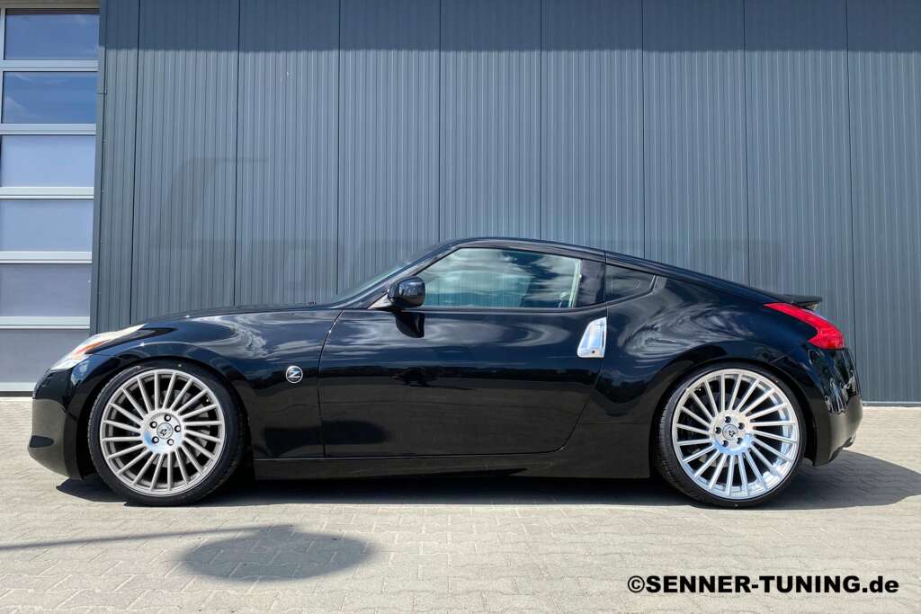 Wie wäre es dann mit einer 20″ / 21″ Kombi? Diese ungewöhnliche Kombination haben wir auf diesem 370Z montiert. Durch die Felgenfarbe in silber frontpoliert wirkt das Rad noch größer! Die Hinterachse mit 11,5×21″ sieht nicht nur von der Seite gewaltig aus, auch von hinten wirkt das Heck noch wuchtiger aus!